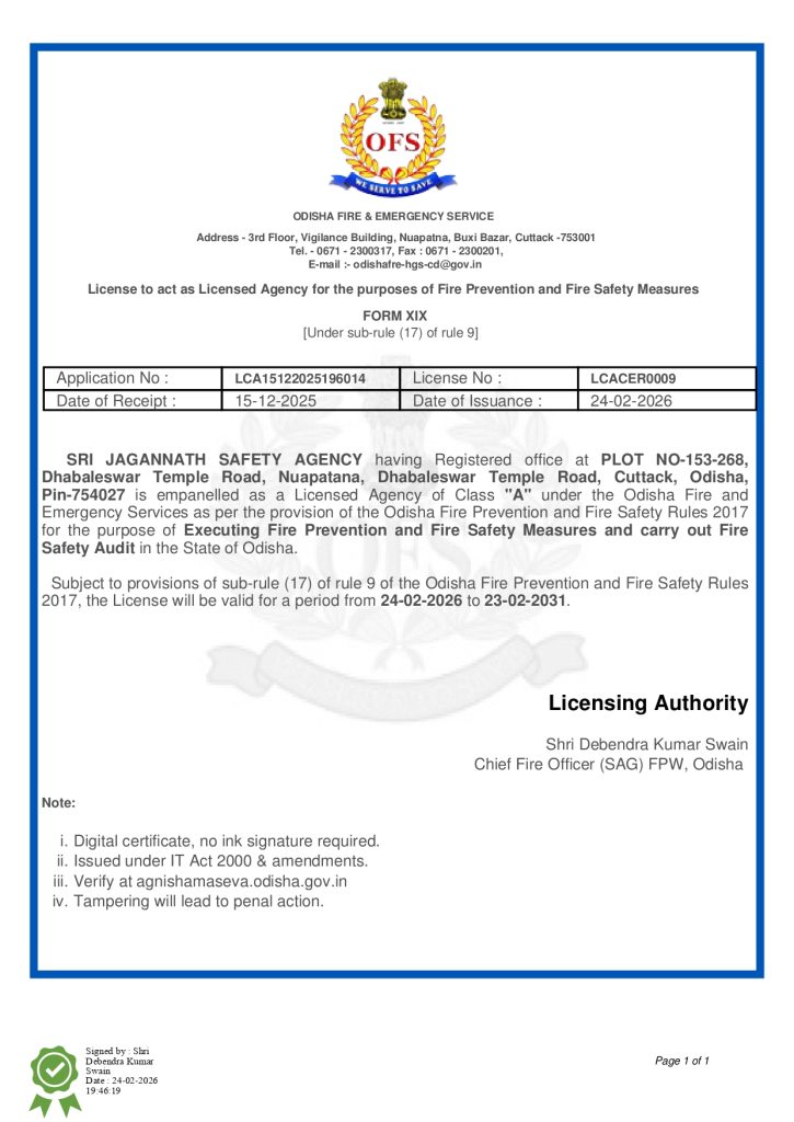 We are officially licensed by the Odisha Fire & Emergency Service under the Odisha Fire Prevention and Fire Safety Rules, 2017. Our agency is authorized to execute Fire Prevention & Fire Safety Measures and conduct Fire Safety Audits across Odisha.