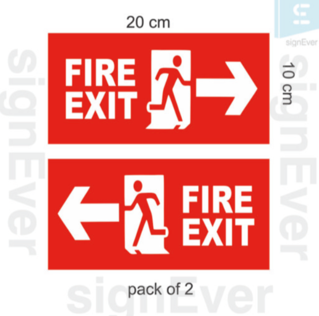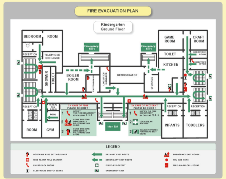 Signage includes floor plans showing exit routes, emergency equipment, and assembly points, as well as clear exit signs to guide people to safety